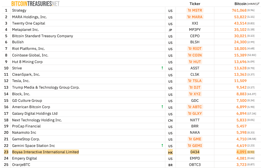 En büyük 25 kurumsal Bitcoin hazinesi. BitcoinTreasuries.NET verisi.